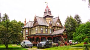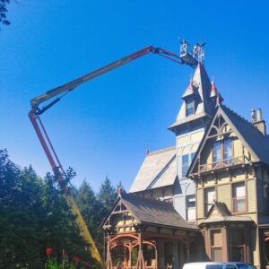 The only thing they had in common was that nothing was within arm’s reach. As you can see from the photo below, a boom crane had to be rented to take the workers up to the work. When he showed up one morning with an extra safety harness, it became apparent that Juan determined that I needed to go up in the 150 foot boom and film the roofline and capture the unique view of Pine Plains.